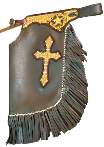 Custom Deluxe Chinks, "deluxe leather", chocolate color.  Accessories shown: Colored Bloodknot fringe-buckskin, Star filigree top yokes, Basket Cross side yokes, Swarovski crystals border for top and side yokes, hidden leg strap attachment.
